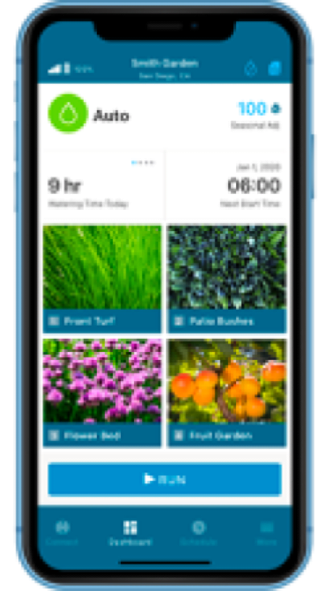The Hunter NODE-BT app has it all! Use the visual dashboard to check station status, total watering time, and the next system start time.